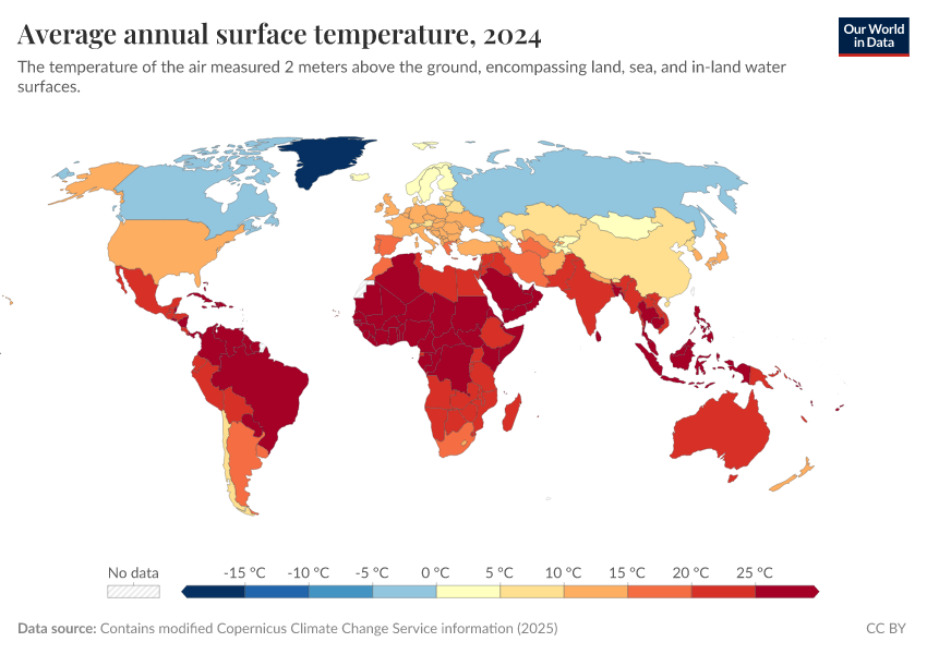 Contains modified Copernicus Climate Change Service information (2025) – with major processing by Our World in Data. “Average annual surface temperature” [dataset]. Contains modified Copernicus Climate Change Service information, “ERA5 monthly averaged data on single levels from 1940 to present 2” [original data]. Retrieved January 2, 2026 from https://archive.ourworldindata.org/20251210-203836/grapher/average-annual-surface-temperature.html (archived on December 10, 2025).