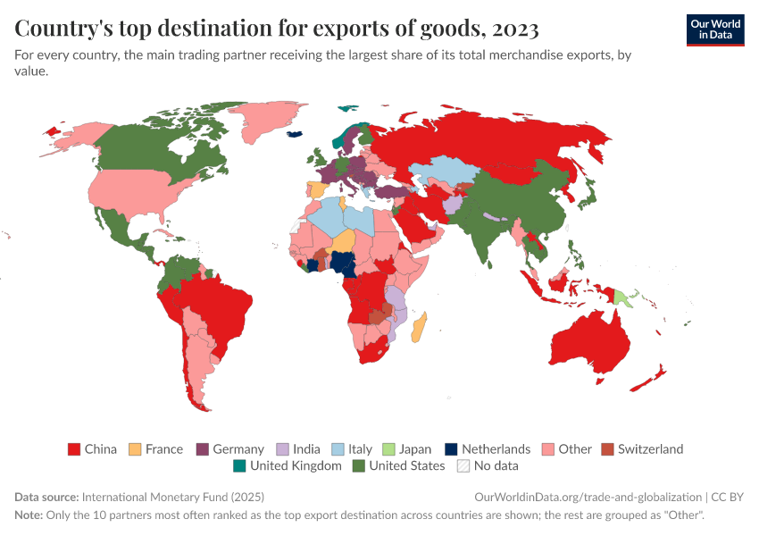 International Monetary Fund (2025) – with major processing by Our World in Data. “Top export partner category” [dataset]. International Monetary Fund, “International Trade in Goods (by partner country) (IMTS)” [original data]. Retrieved January 3, 2026 from https://archive.ourworldindata.org/20251114-012441/grapher/countrys-top-destination-for-exports-of-goods.html (archived on November 14, 2025).